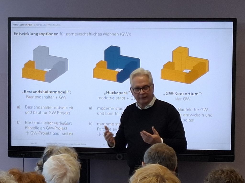 Röhrig stellte drei Entwicklungsmodelle für gemeinschaftliches Wohnen vor, die im Deutzer Hafen angedacht sind: Beim „Huckepackmodell“ entwickelt und baut die moderne stadt entweder für das gemeinschaftliche Projekt oder verkauft eine Parzelle im Baufeld an das Projekt, das dann selber baut. Im „Bestandshaltermodell“ übernimmt dieser die gleiche Rolle als Baufeldentwickler. Im „Konsortium“ genannten Modell, entwickeln und bebauen mehrere Gruppen ein ganzes Baufeld selber. Letzteres Modell ist eher für die Halbinsel geeignet.