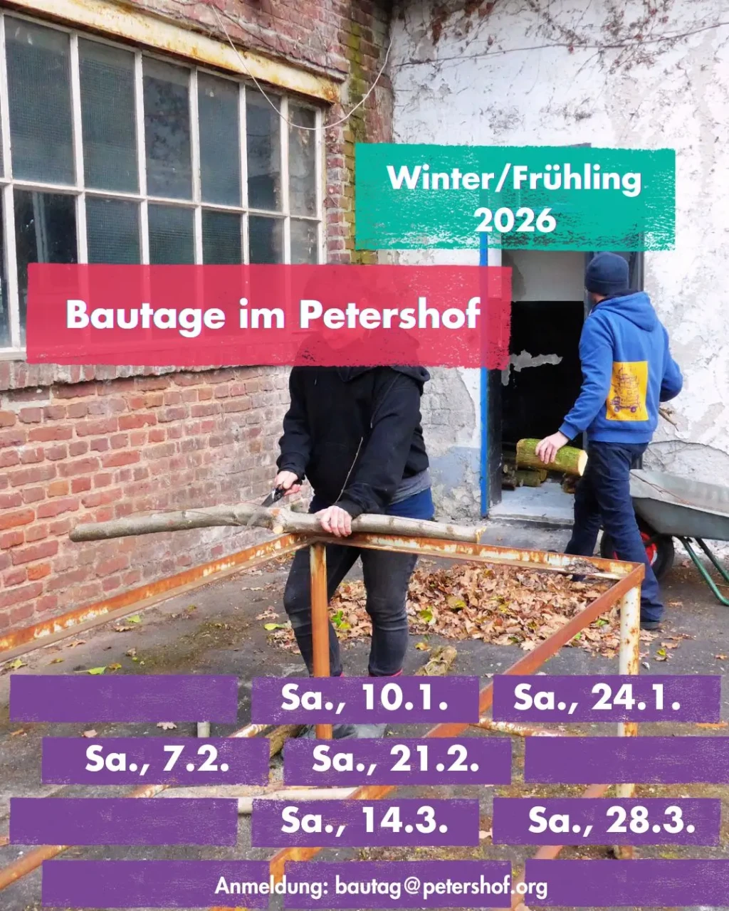 Du schwingst gerne den Hammer? Ein Bauhelm macht dich froh? Oder nix davon, aber du kochst gerne für große Gruppen? Toll, dann suchen wir genau dich. An unseren Bautagen bereiten wir den Petershof in Eigenleistung auf die Sanierung vor. Unter fachkundiger Anleitung reißen wir Wände ein und Tapeten ab und sortieren wiederverwertbare Baumaterialien. Wir freuen uns über jede helfende Hand, denn es gibt viel zu tun. Melde dich zu unseren Bautagen an, indem du eine Mail schreibst an bautag@petershof.org. Dann erhältst du weitere Informationen.