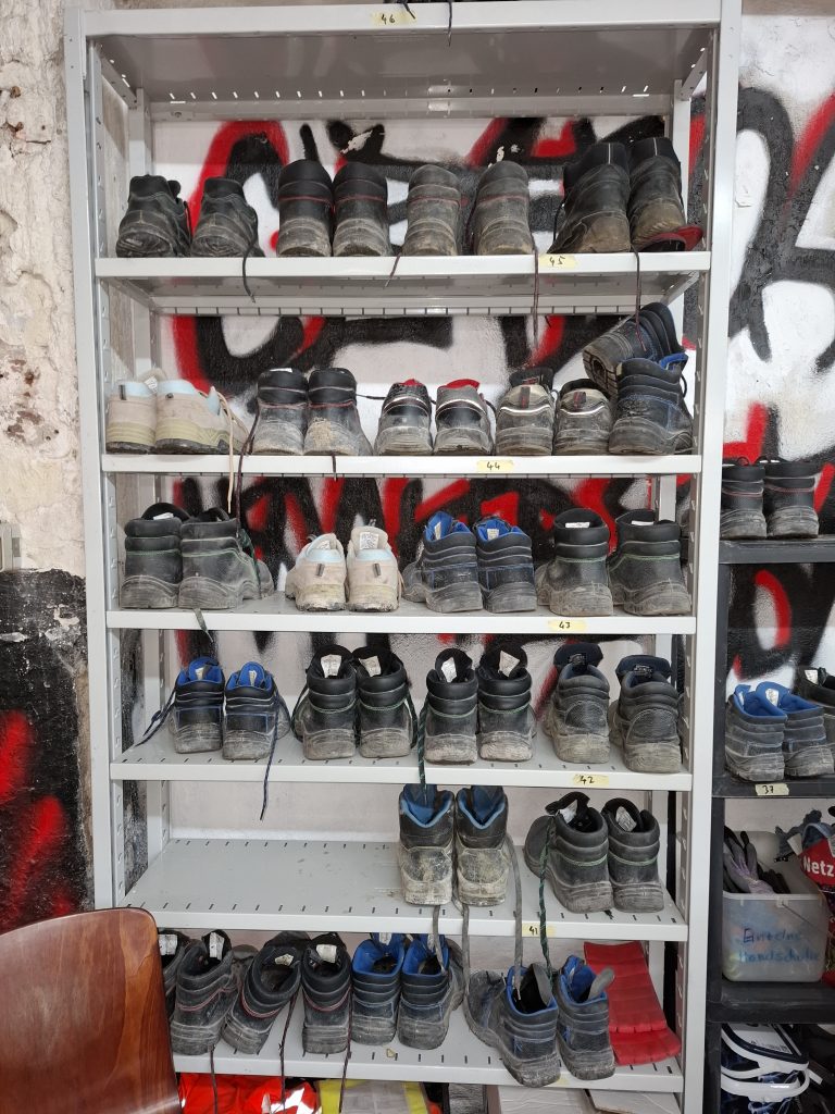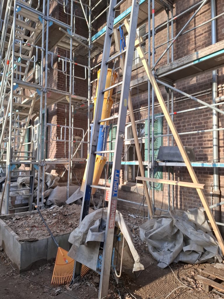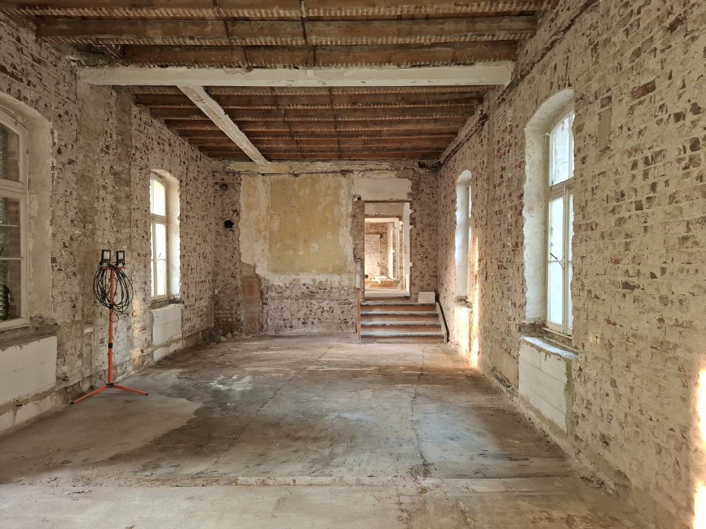 Auf der Baustelle kann es jetzt richtig losgehen, Firmen können beauftragt werden. Trotzdem ist tatkräftige Hilfe willkommen. Der alte Innenputz ist von den Genoss:innen schon überall abgeschlagen worden, nun soll auch in Eigenleistung mit Hanflehm von innen gedämmt werden, damit die denkmalgeschützten Ziegelfassaden sichtbar bleiben können. In Frankreich ist diese Bauart schon verbreiteter, die Machbarschaft will zeigen, dass das auch in Köln im größeren Maßstab geht.